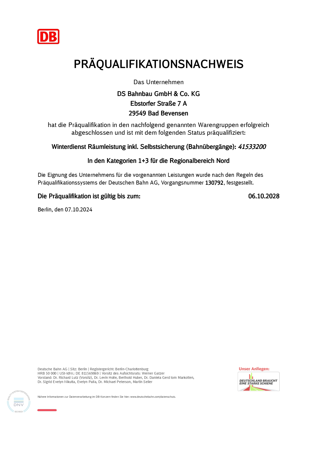 Auch intern betrachten wir Nachhaltigkeit, Effizienz, Sicherheit und Zuverlässigkeit als unsere wichtigsten Werte und richten alle Arbeitsprozesse bei DS Bahnbau danach aus. Qualitätsmanagement ist bei uns gelebte Unternehmenskultur, was unsere Zertifizierung nach ISO EN 9001:2015 belegt.
