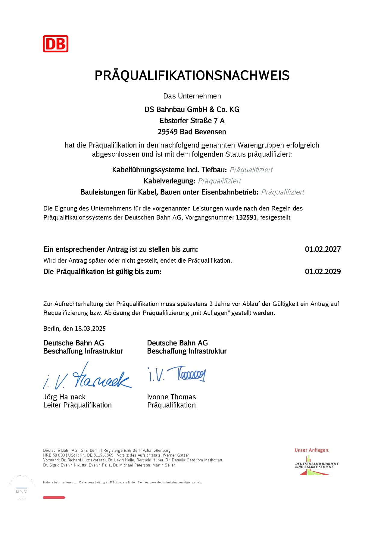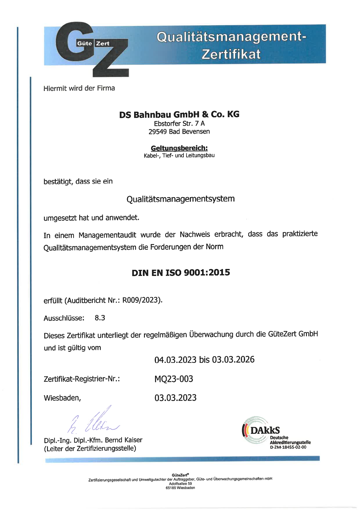 Qualitätsmanagement ist bei uns nicht nur ein Leistungsbereich, sondern gelebte Unternehmenskultur. DS Bahnbau ist Ihr qualifizierter Fachbetrieb für Kabel-, Tief- und Leitungsbau, zertifiziert nach ISE EN 9001:2015.